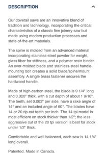 Veritas dovetail saw – 14 tpi Rip